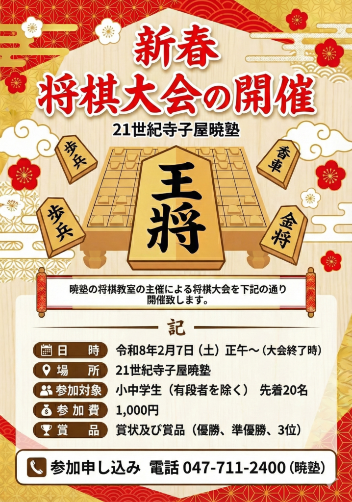 2月7日(土)に小中学生対象の将棋大会を行います。